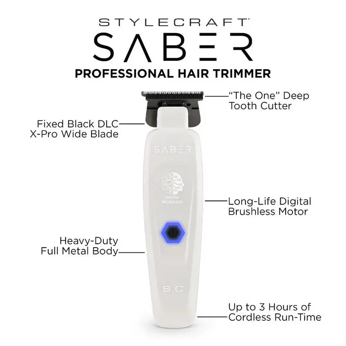 StyleCraft Saber Professional Hair Trimmer with Digital Brushless Motor - White